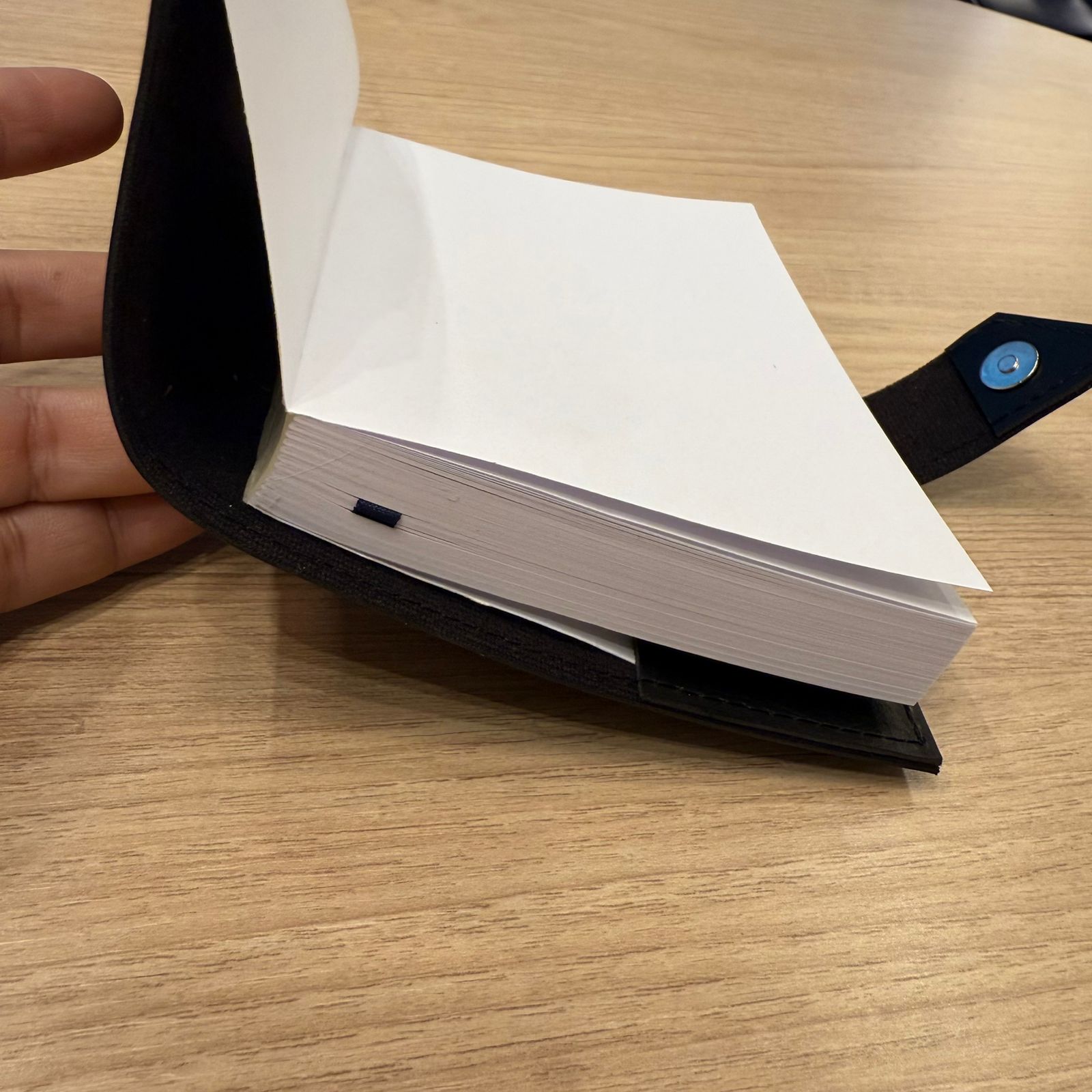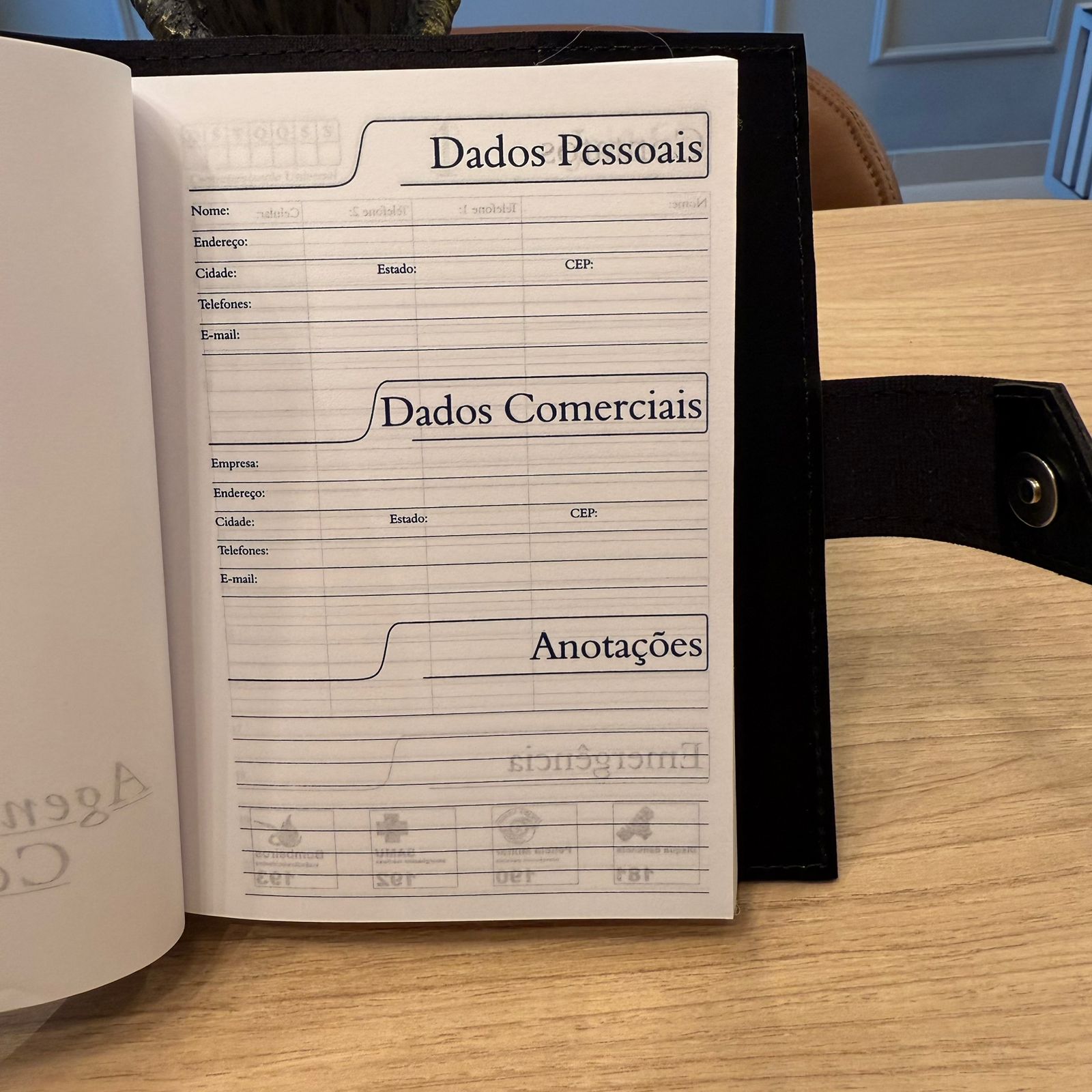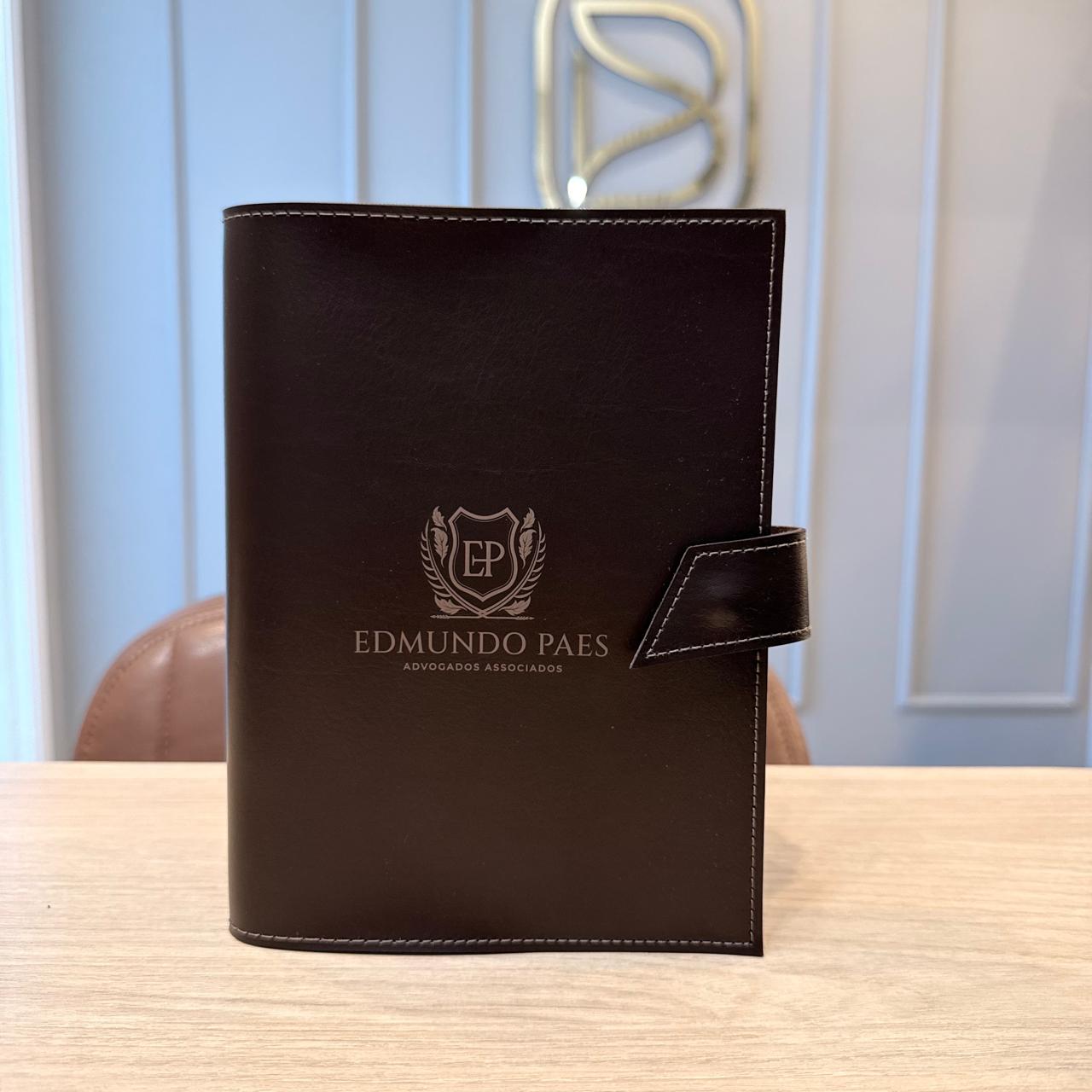Esse modelo de agenda o miolo é costurado e encaixado na capa.