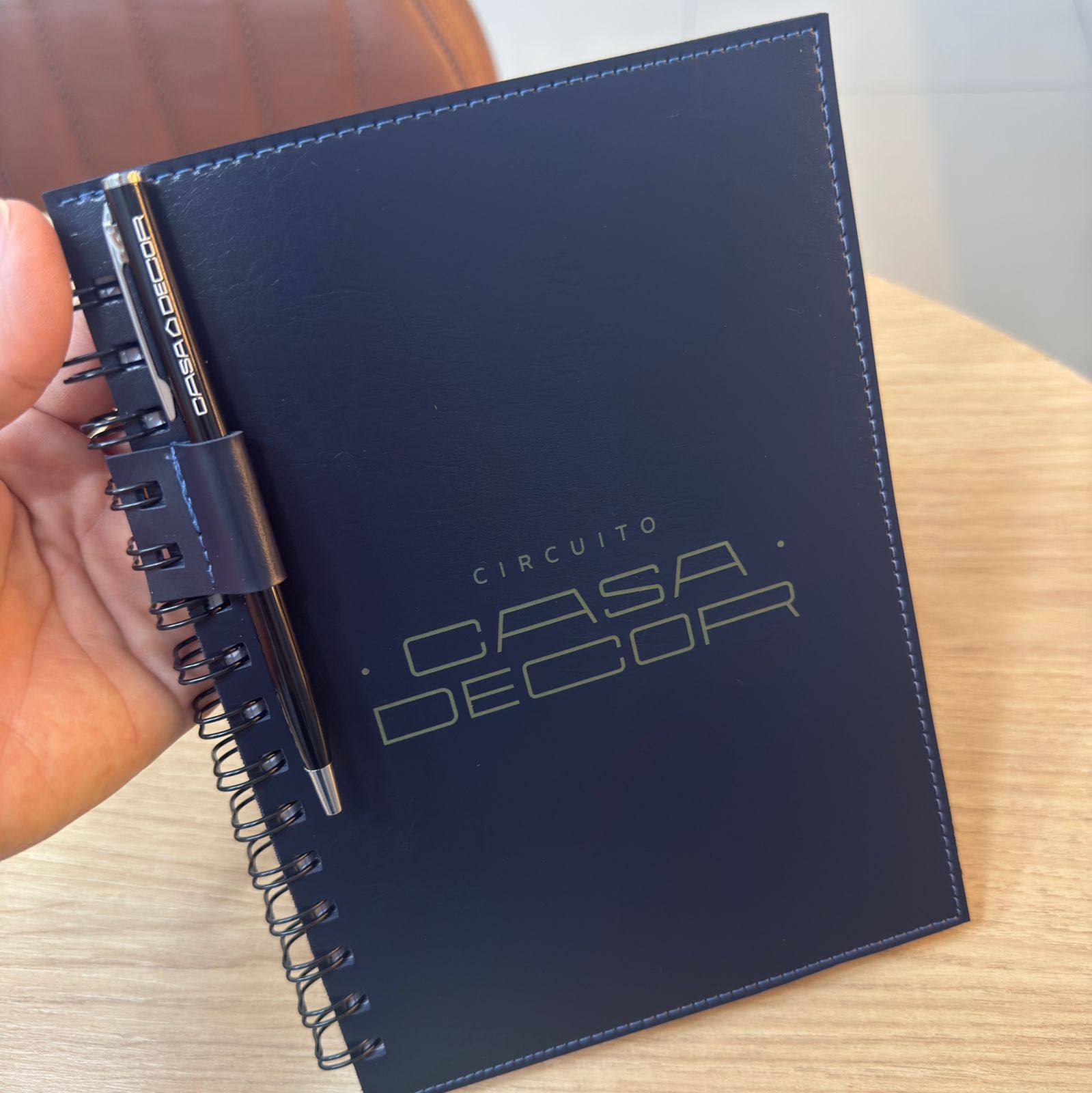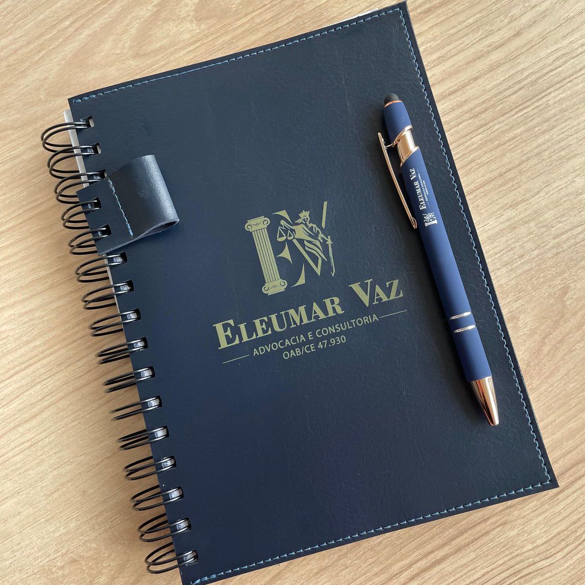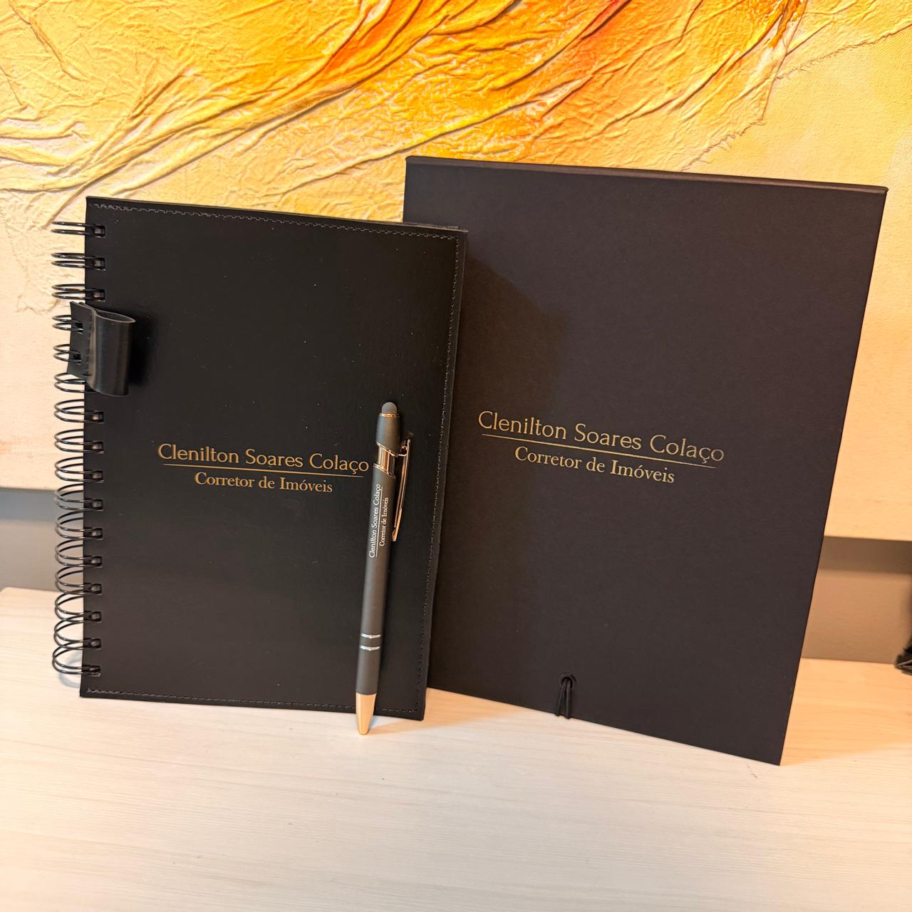 Caderno com Caneta - 15x21cm - 100 folhas pautadas com local para acrescentar data.